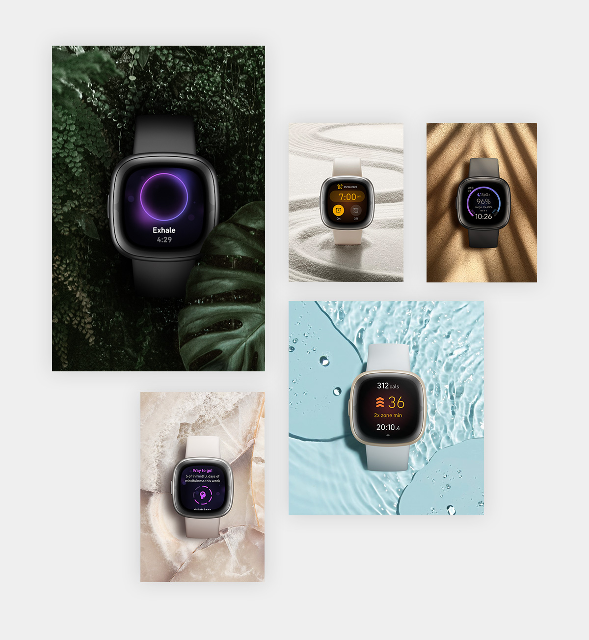Fitbit wanted to create a unique visual experience for their latest smartwatch launch. I created a bento box design system to elegantly display their various product screens, and weaved in photo composited nature shots to create a masonic experience.